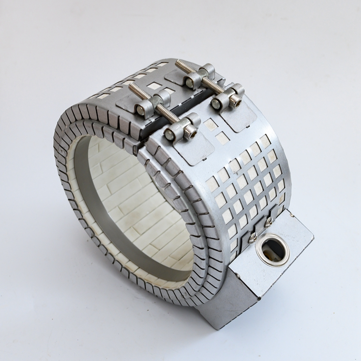陶瓷加熱圈的核心技術(shù)在于其陶瓷條穿絲結(jié)構(gòu)和高頻陶瓷導熱介質(zhì)。相較于傳統(tǒng)云母加熱圈,它的功率高出0.5~1.5倍,最大表面負載可達6.5W/cm2。發(fā)熱絲以彈簧形態(tài)穿繞于陶瓷條中,外罩不銹鋼殼體,并填充硅酸鋁纖維保溫棉,有效防止熱量散失,提升熱效率。